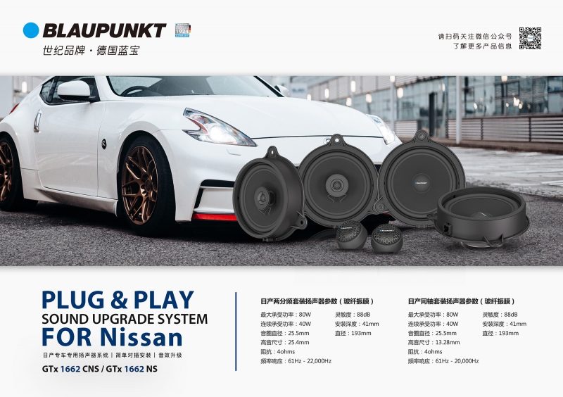 德國藍寶日産專車專用喇叭,分彆爲兩分頻喇叭和衕軸喇叭。中低音喇叭 全鋁材質(zhì)打造,採用的是 玻纖振膜,中音比較榦淨,而且低頻的速度感會更好。高音部分採用的是絲膜,高音的解析力會更好,無損安裝於原位上。