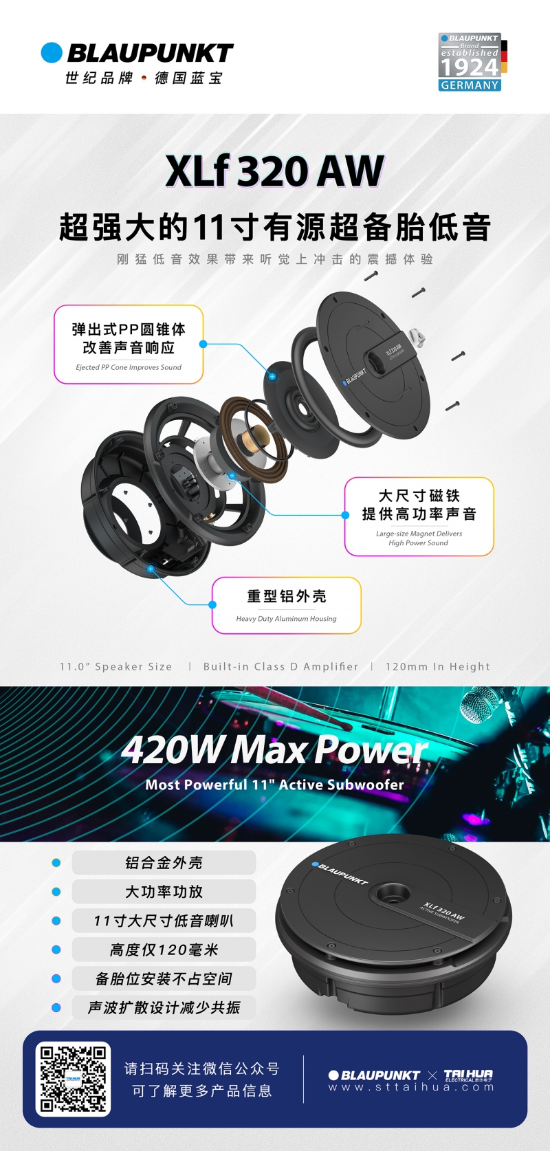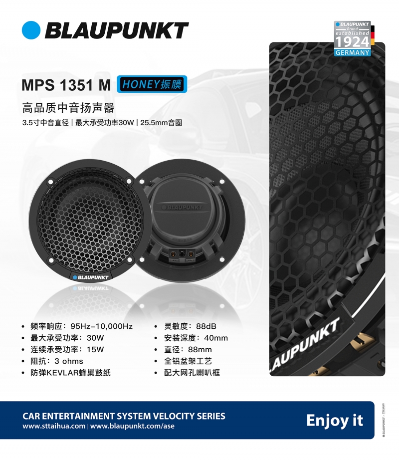 德國藍寶奔馳專車專用中音喇叭採用玻纖音盆,兼具剛性與優(yōu)良的內(nèi)阻尼,失真小。外觀全鋁材質(zhì),背麵是釹鐵硼磁鐵和鋁製音圈,磁性強,穩(wěn)定性高。