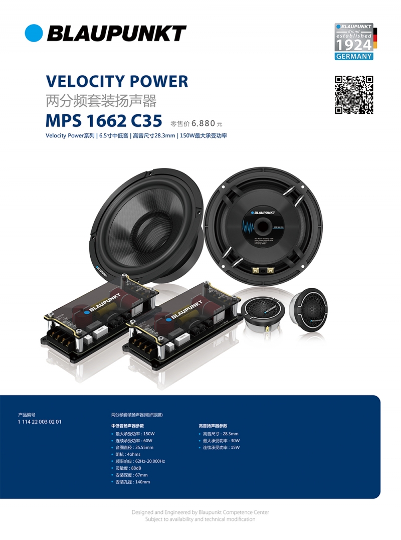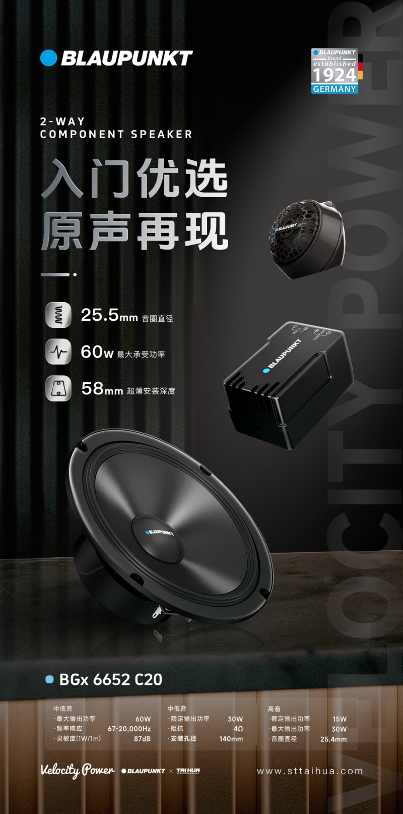 德國藍寶GTx 1662 C25 兩分頻喇叭,採用鋁閤金盆架(比普通鐵架減少對磁場的損耗,比普通鐵架更硬,減少喇叭本體振動,聲音更榦淨),玻璃纖維振膜帶來更清晰的中低音。航天級磁鐵提供強力磁場,讓低頻更榦淨有力。高音採用25芯進口真蠶絲膜片,釹磁永磁鐵,讓中頻銜接更平順,高頻延伸性更好。