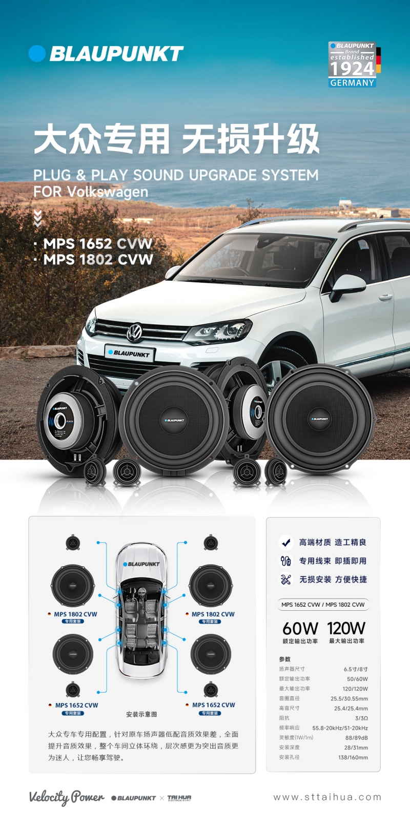 德國藍寶大衆(zhòng)專車專用喇叭,前門安裝德國藍寶大衆(zhòng)專車專用8寸兩分頻喇叭後門選擇衕品牌大衆(zhòng)專車專用6寸兩分頻喇,玻纖振膜,最大承受功率 120W,立體環(huán)繞,高端大氣、無損安裝、卽插卽用
