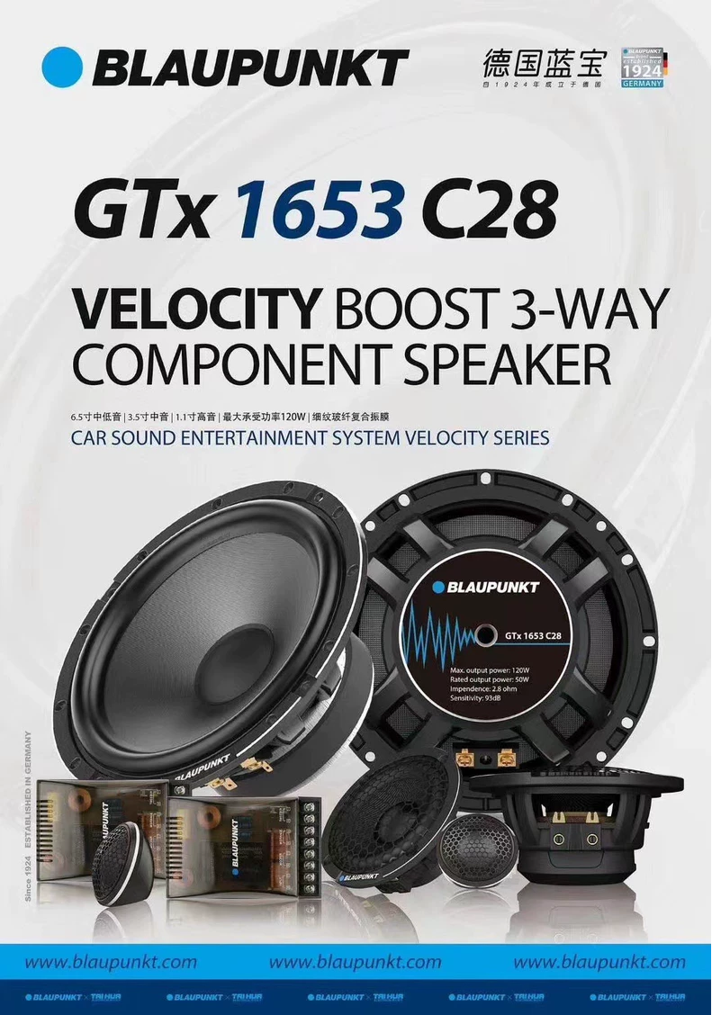 德國藍寶高品質(zhì)三分頻套裝 GTx 1653 C28 整套三分頻,超高性價比,中低音和中音採用的都是細紋玻纖複閤振膜,高音採用蠶絲一體複閤振膜,音色清晰穩(wěn)定人聲飽滿豐富;盆架爲高級鋁閤金鑄造, 具備更強的抗扭麴能力, 能長時間工作;內(nèi)部高級磁鋼反應快,磁性強,能讓髮音更加榦淨有力。人聲還原真實,聲場立體豐富,整體層次感以及人聲的細膩度都錶現(xiàn)得淋灕盡緻!