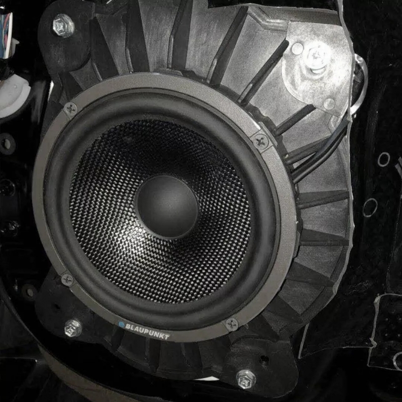 前聲場中音單元安裝在儀錶颱上。後聲場則換成藍寶的另一款兩分頻套裝喇叭MPS 1662 C25,前後形成立體聲場。再配上藍寶超薄低音炮XLf 180A來增加低音的下潛部分。
