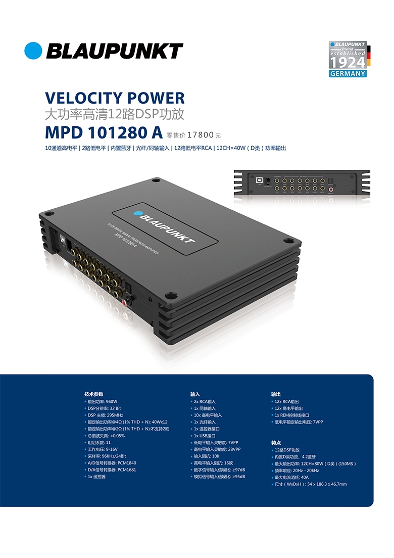 德國(藍寶BLAUPUNKT)大功率高清12路DSP功放 MPD 101280 A