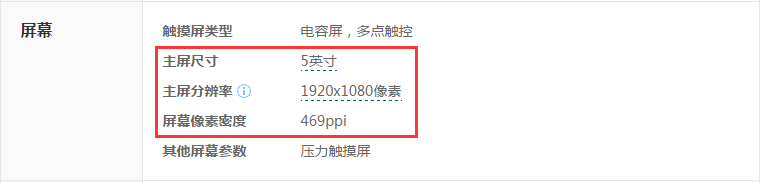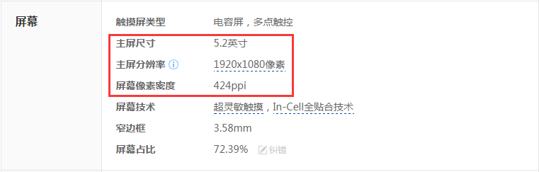 咱們從手機(jī)開始說起吧。先上一張圖,給大家看看關(guān)于手機(jī)屏幕方面的一些參數(shù)。紅框內(nèi)的三個參數(shù),大家一定都不陌生,我也不陌生。不過講真的,就在不久前,我連手機(jī)的屏幕尺寸到底是怎么算出來的都不知道。下面我們開始慢慢講。